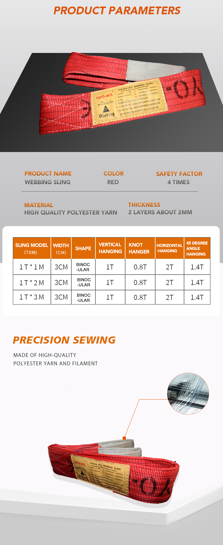 • Material Double Ply Polyester web sling width reinforcedlifitng eyes.