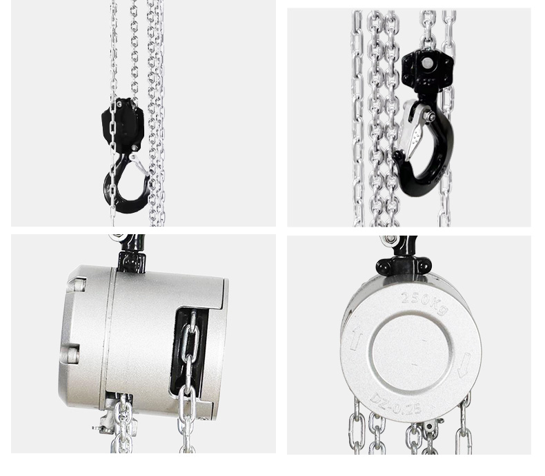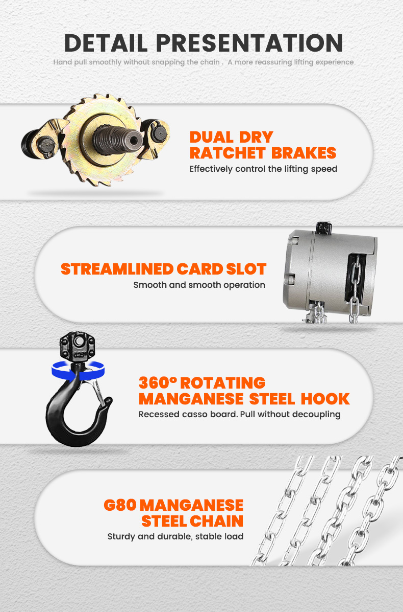 • Suspension devices and load-bearing hooks are madeof anti-aging and high strength alloy steel. In case ofoverloading, deformation will occur first and not suddenlybreak.